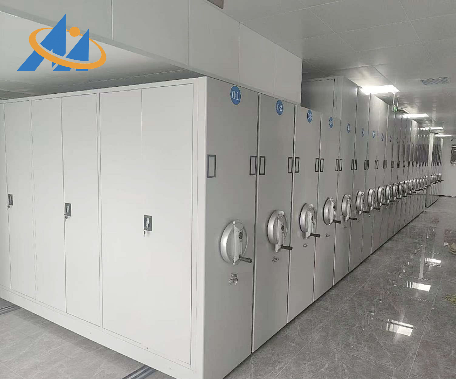 (2)架頂應設防塵裝置,列與列之間應裝有20mm厚特種抗老化橡塑磁性密封條,門面列和中間移動列分別裝有鎖具和制動裝置,每組密集架閉合后可用總鎖鎖住,形成一個封閉的整體,各列移開后可單獨制動,確保人員安全,底部應設防鼠、防傾倒裝置。